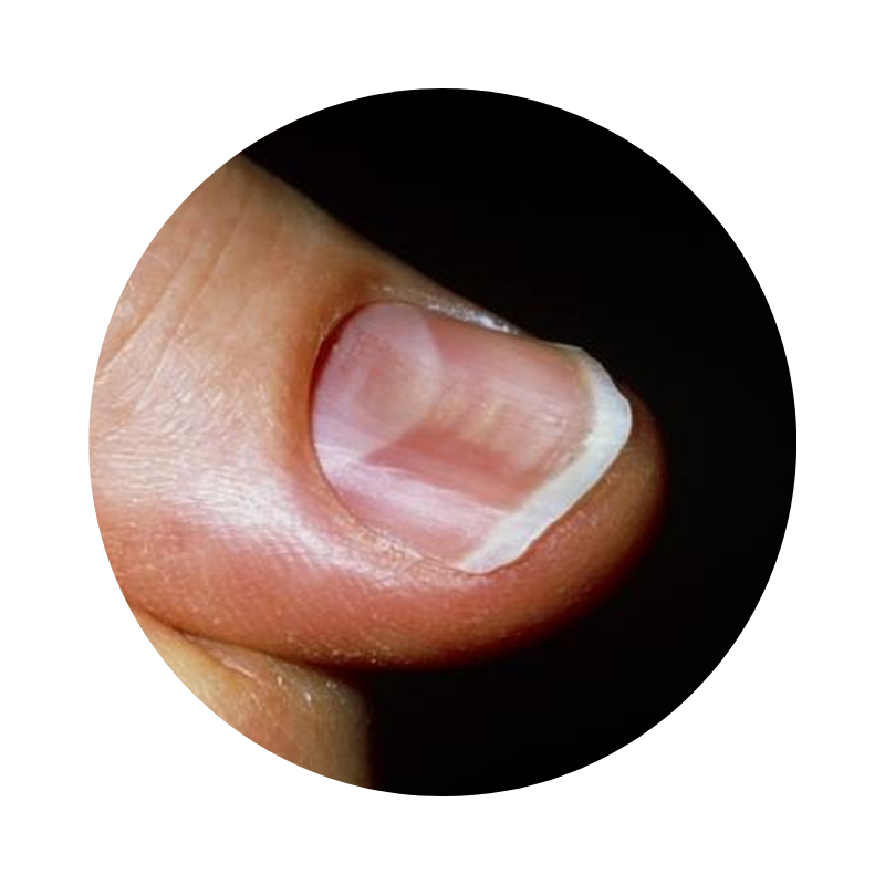 Leuconiquia: son las clásicas manchas blancas horizontales sobre las uñas. Pueden ser causadas por golpes o fallas en la matriz de la uña.