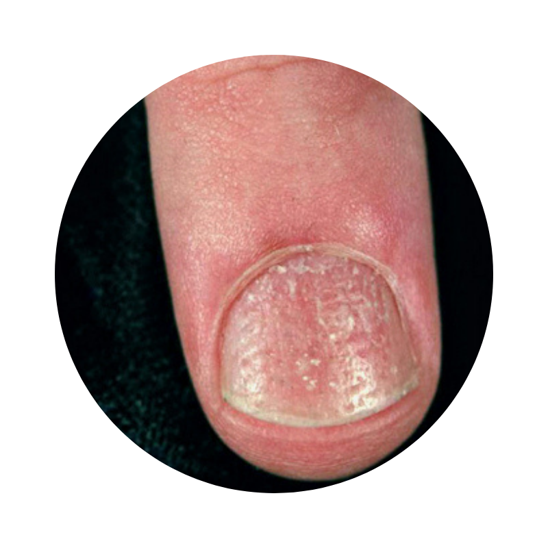 Oniquia punctata: o uña de dedal, se caracteriza por tener pequeños agujeros o erosiones sobre la uña, puede ser causada por psoriasis u hongos y no se recomienda trabajar ya que se desconoce la presencia de agentes infecciosos.