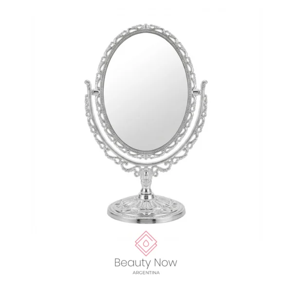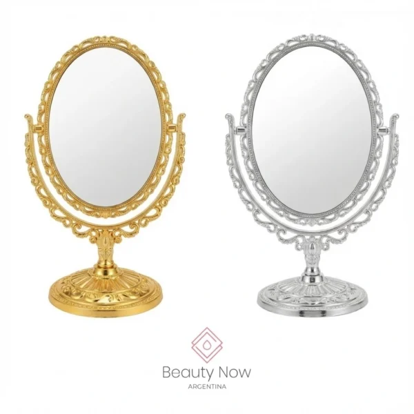 El Espejo Oval Royal es un espejo decorativo de tocador de estilo vintage que realza gabinetes profesionales y tocadores personales. Su marco con terminación tipo metálica en tonos dorado o plateado y el vidrio de alta claridad aportan elegancia y una visual nítida para maquillaje y peinado.