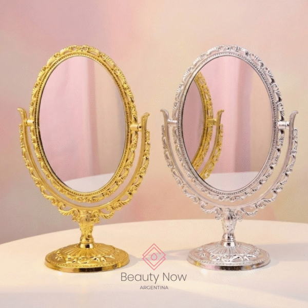 El Espejo Oval Royal realza cualquier espacio con su diseño vintage y acabado metálico brillante. Ideal para tocadores, gabinetes o rincones de belleza, combina elegancia y funcionalidad en una pieza decorativa que eleva tu rutina diaria.