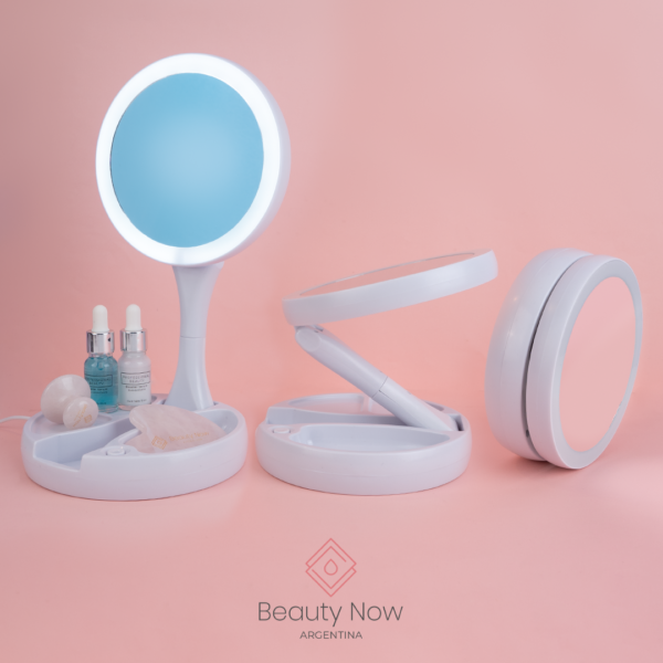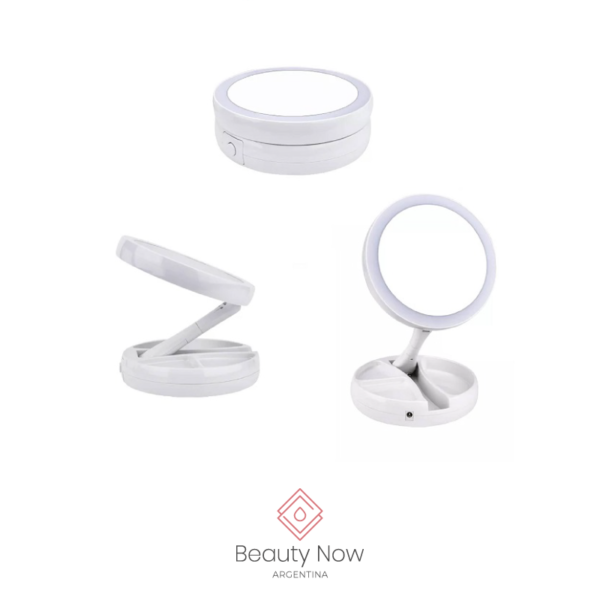 Este espejo cuenta con aumento 10x y luz led integrada para una correcta visión del rostro, y un compartimiento, para guardar cosméticos pequeños.