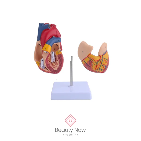 Es de tamaño real y su diseño está dividido en dos partes con una estructura desmontable. Presenta las cuatro cámaras del corazón, válvulas y vasos sanguíneos principales para una comprensión integral de la función cardíaca.
