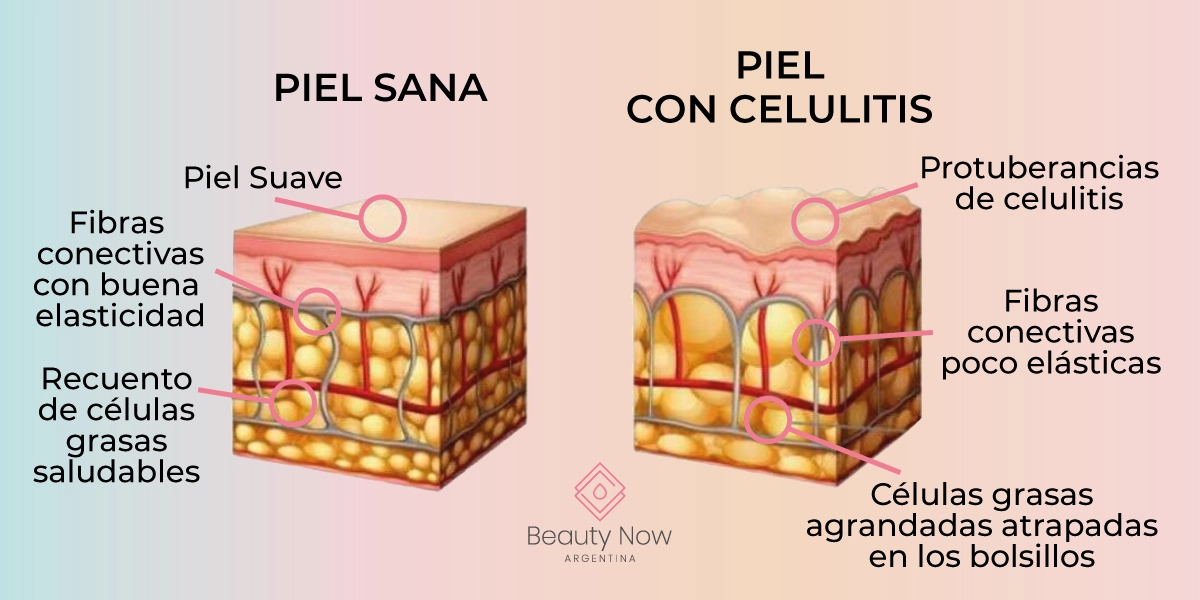 Se forma debido a un aumento en el número o tamaño de las células de grasa, llamadas adipocitos, que comprimen los capilares sanguíneos, impidiendo que el oxígeno llegue a los tejidos y obstruyendo así el flujo sanguíneo y linfático. El tejido adiposo se “asoma” desde la hipodermis (la capa más profunda de la piel) hacia la dermis, que empujan a las capas superiores y generan la típica apariencia de “piel de naranja”.